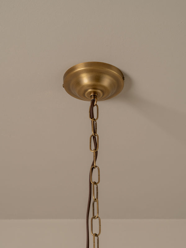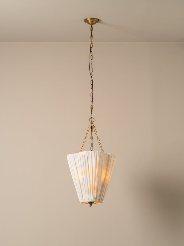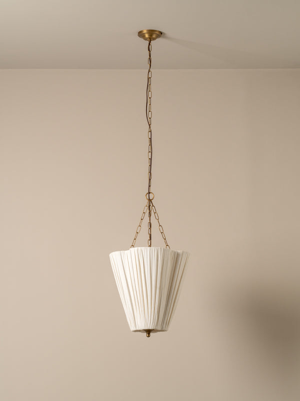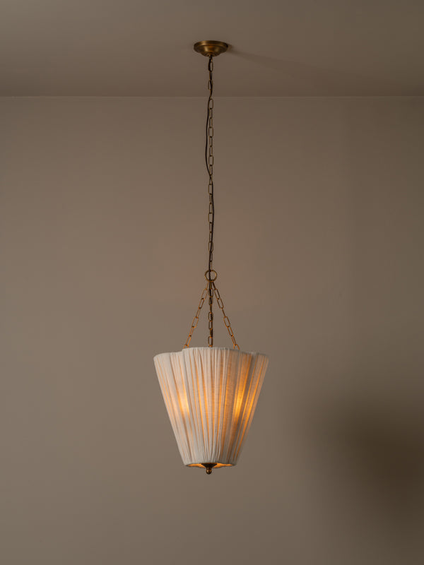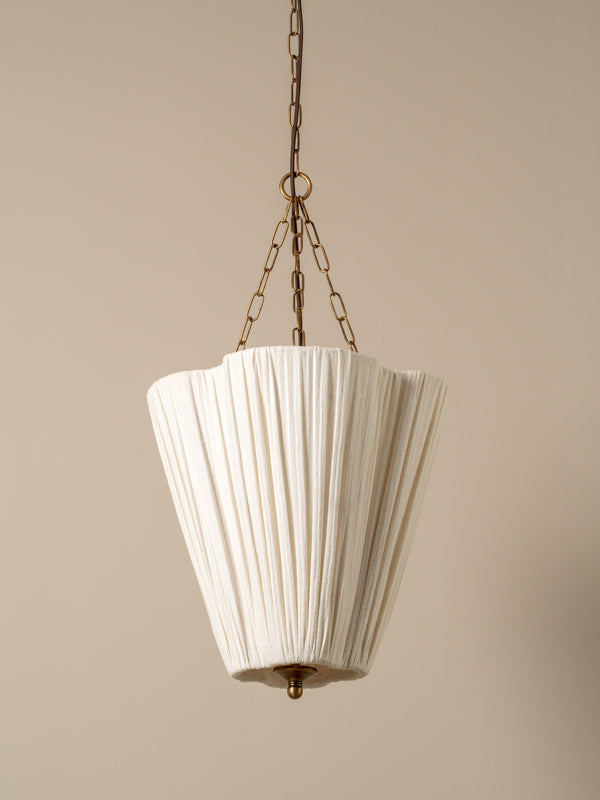 | Inspired by our much loved Lindi pendant, the Fosse was designed to offer the same soft, tactile and floral feel in a format more a kin to a lantern. Detailed with classic elements of an aged brass finial, chain and moulded ceiling mount, we think of this as a coming of age for a bestseller. The size and proportions of the Fosse linen lantern mean it can be hung in a variety of locations: bedside, over a table, in the kitchen or entry hallway... or why not hang them everywhere?! |