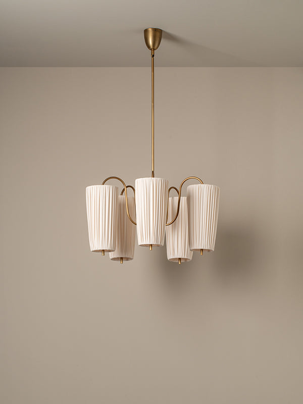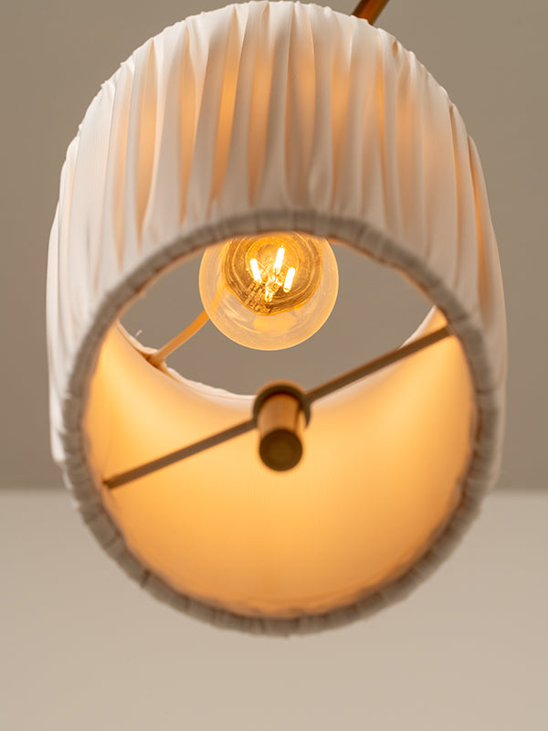 | With Langley we've quite literally take a classic chandelier and turned it on its head! We've created a graceful aged brass chandelier with "up and over arms" to hang each elongated and upturned tapered shade. Made from a soft cream matt fabric, these tall hand pleated shades create a warm hue ideal for winding down of an evening. Each shade is finished with an aged brass finial detail. The central drop rod comes with removable sections to allow you to adjust the overall height as you wish. |