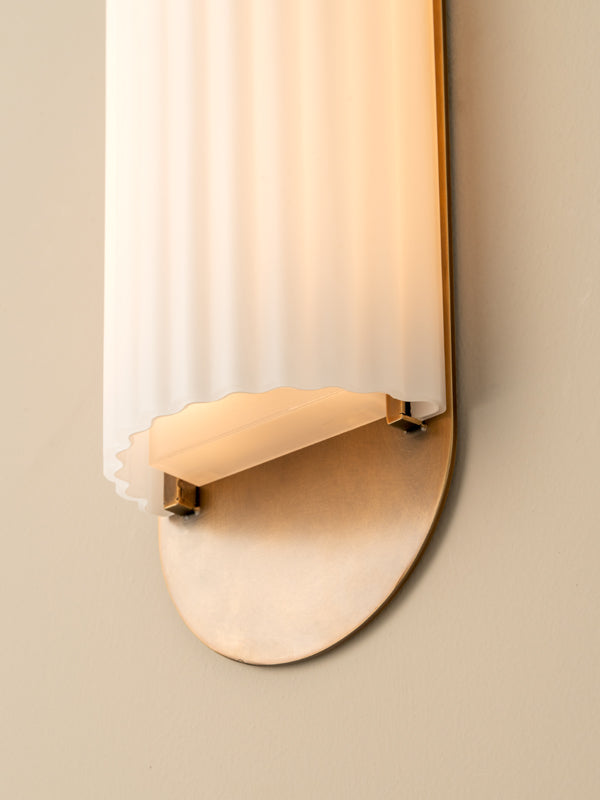 | With the Wilcote wall light we've managed to combine minimalism, femininity, a level of industrial design as well simplicity and detail all in one! The rounded aged brass plate fits flush to the wall whilst the fluted opal glass shade wraps around the integrated LED light box. The Wilcote emits an even and perfectly diffused warm white light. Atmospheric and practical at the same time - its IP44 rated so perfect for the bathroom too. |